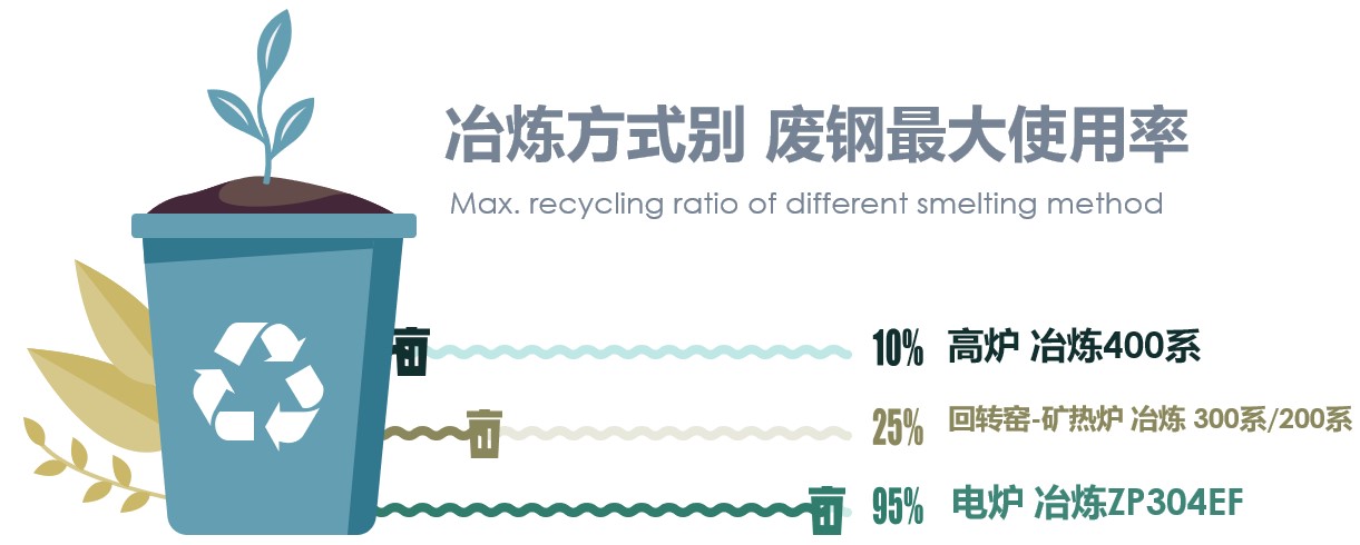 在循环利用方面,相对于常见的高炉冶炼及RKEF矿热炉冶炼的材料,电炉冶炼的ZP304EF废钢比例最高可达到95%,是循环利用率最高的材料之一