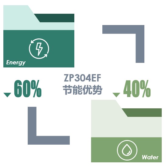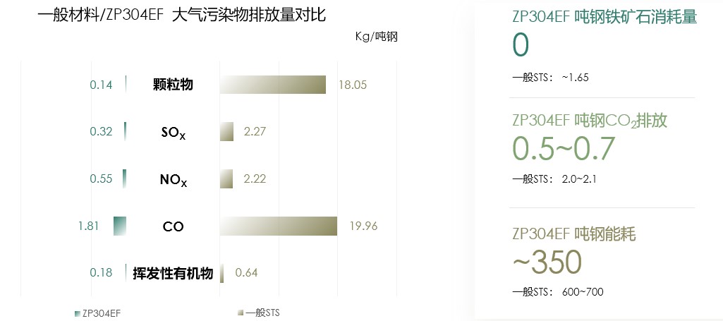 在减少排污方面,ZP304EF对比一般的STS,生产制造过程中排放的废污染物大幅减少,例如:减少CO2 70%、废水 76%和废渣 97%